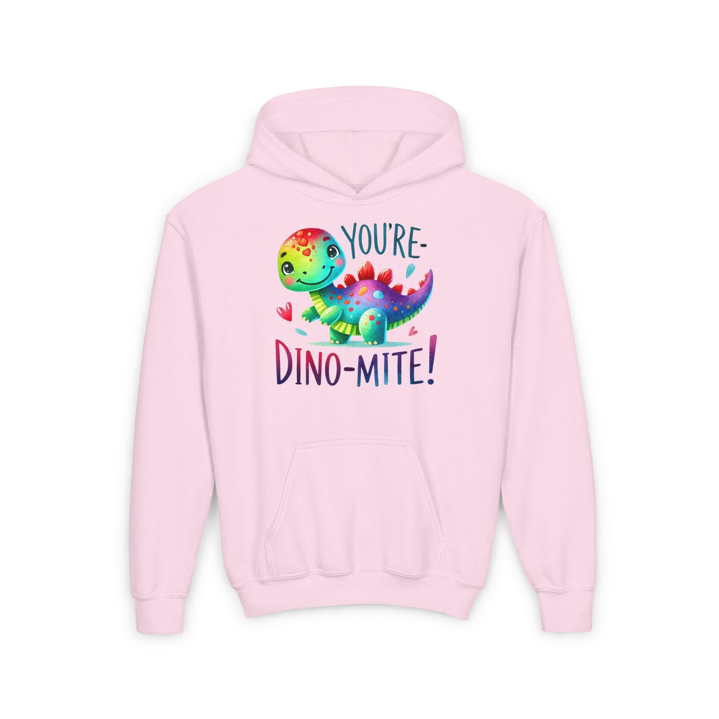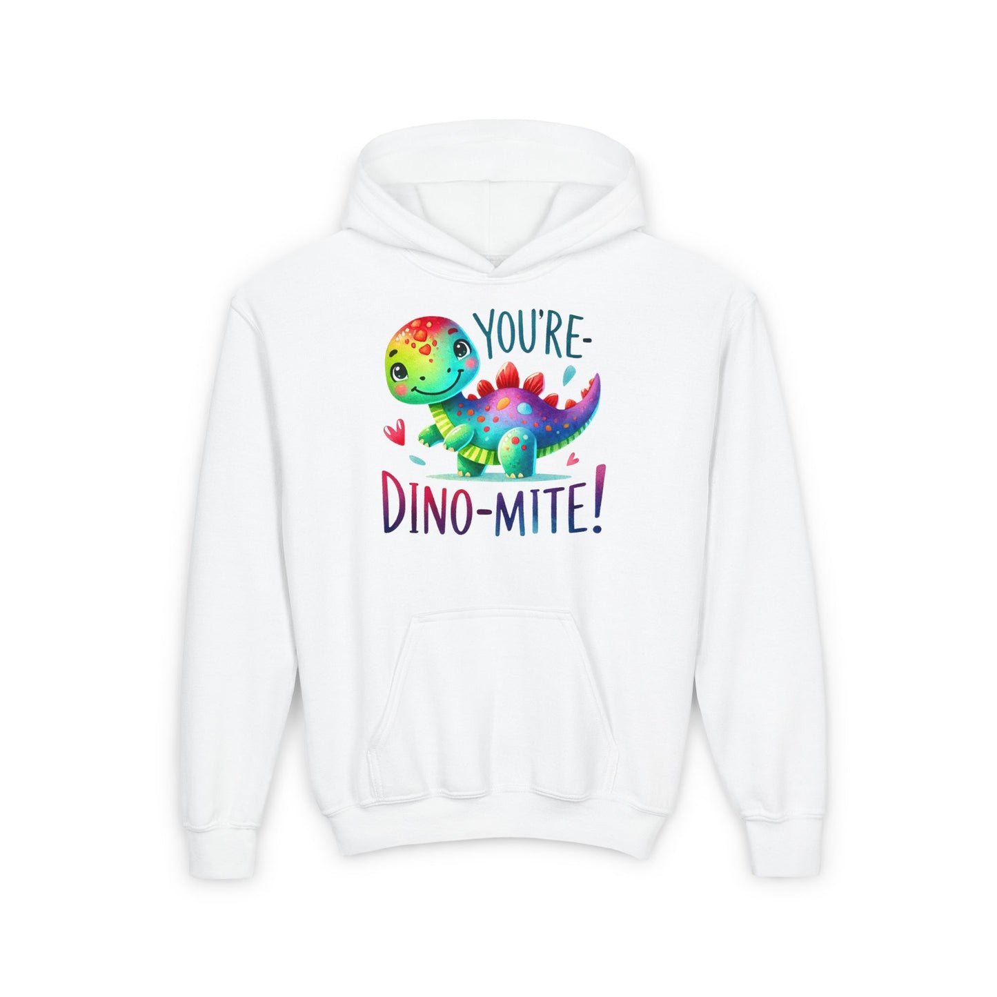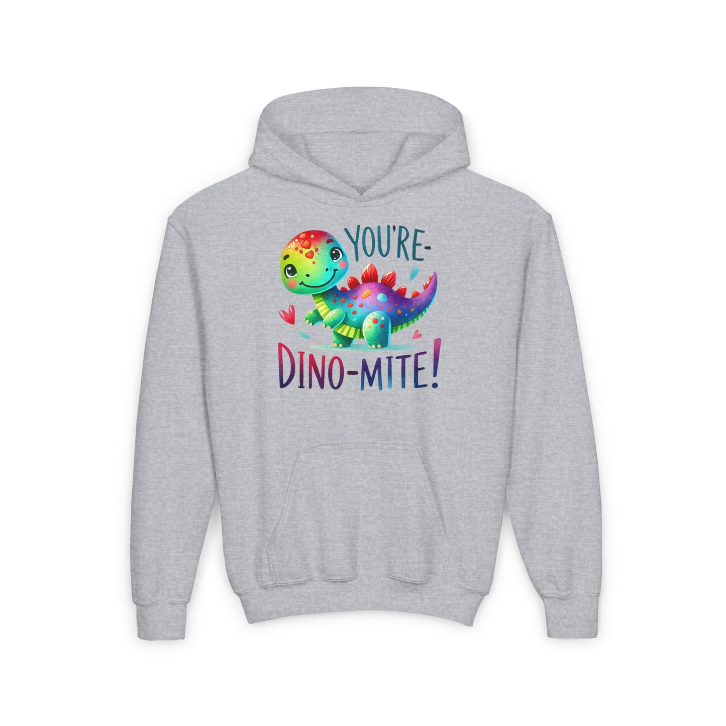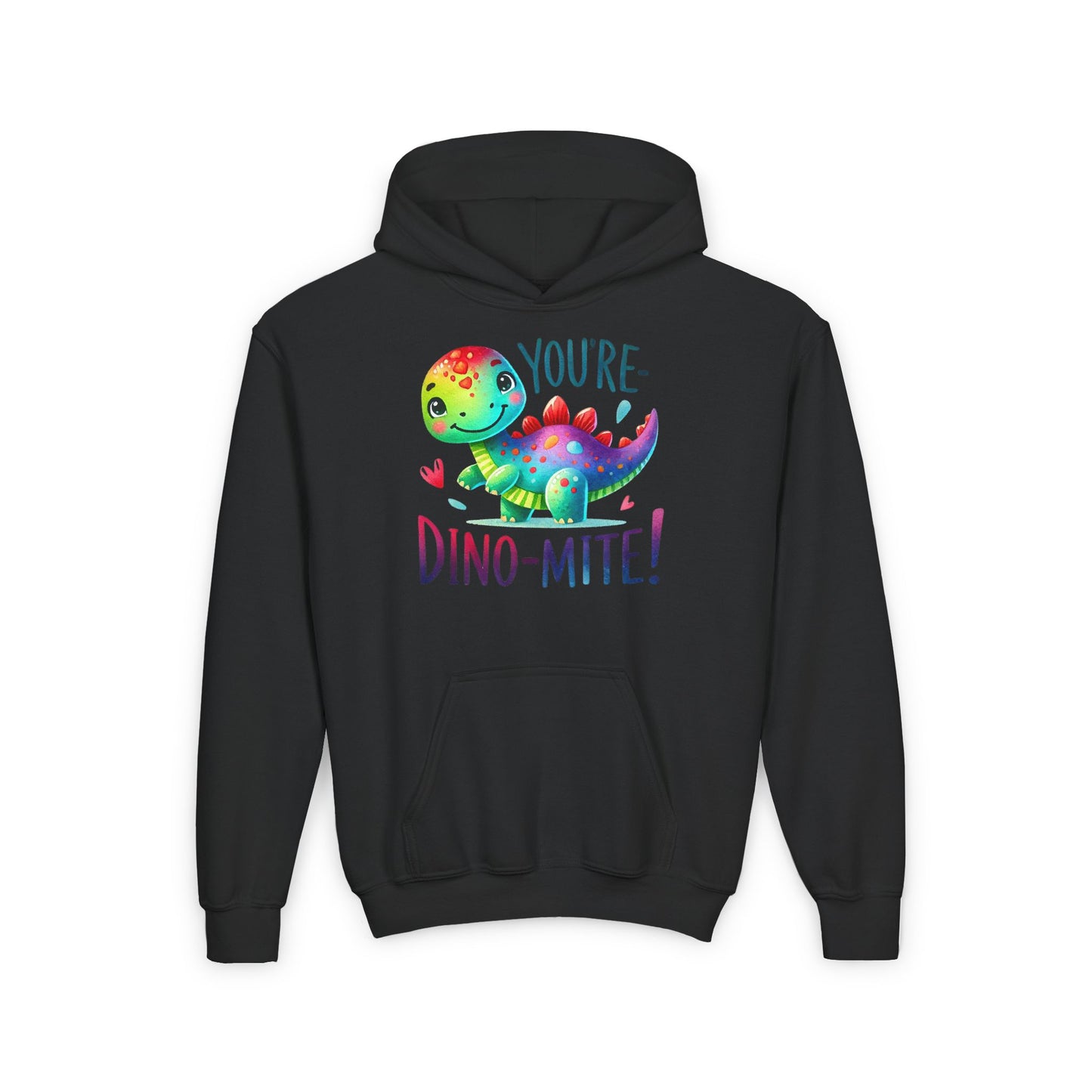 Bring prehistoric charm to your little one's wardrobe with the Dino-Mite Youth Hoodie! Featuring a vibrant, rainbow-colored dino surrounded by hearts, this hoodie is perfect for kids who love big adventures and even bigger hugs. Whether it’s Valentine’s Day or just another day to feel special, this hoodie will have them roaring with joy.