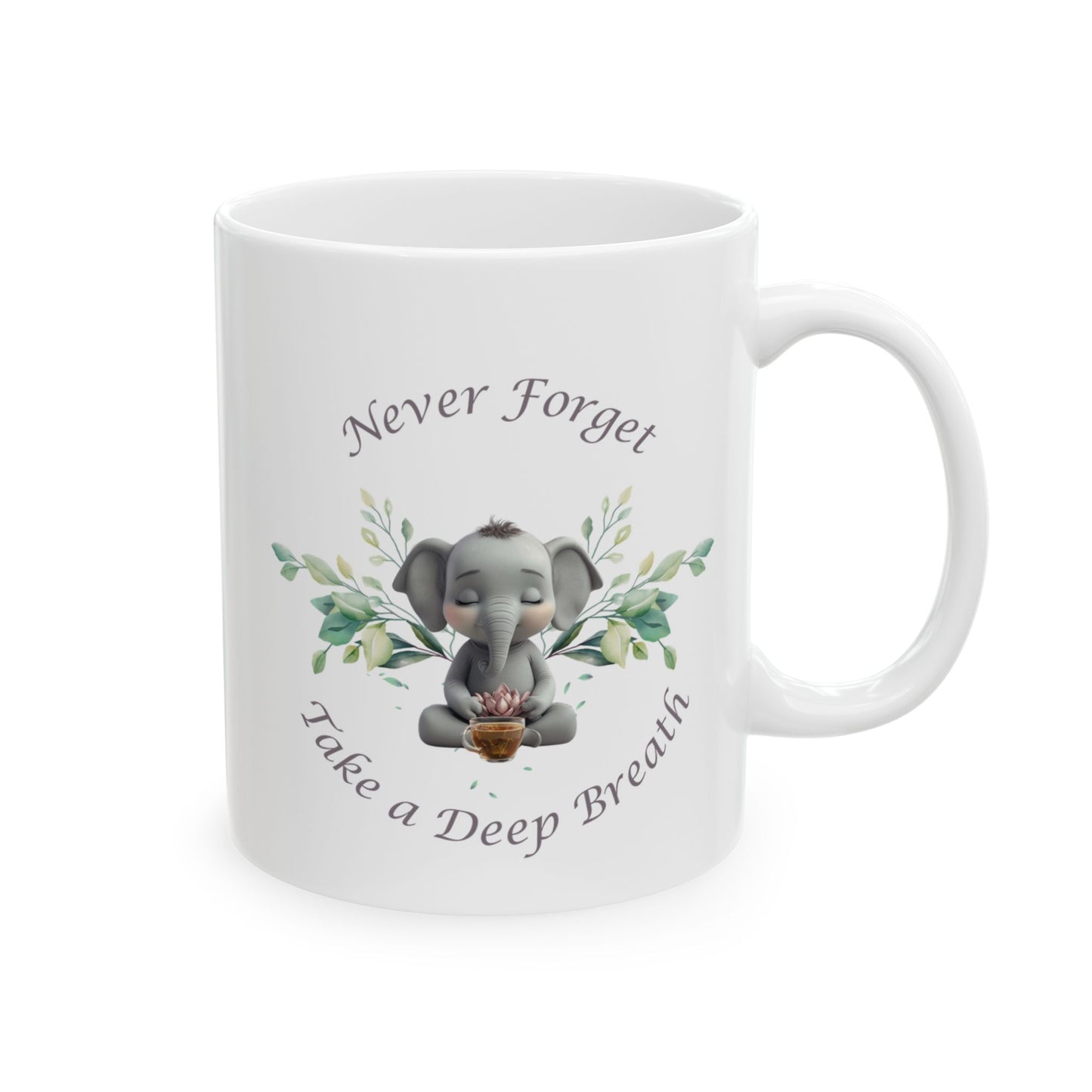 Find peace with the Never Forget Elephant Mug! This charming design features a meditating elephant reminding you to take a deep breath. Whether for tea or coffee, this mug combines mindfulness and practicality in every sip.