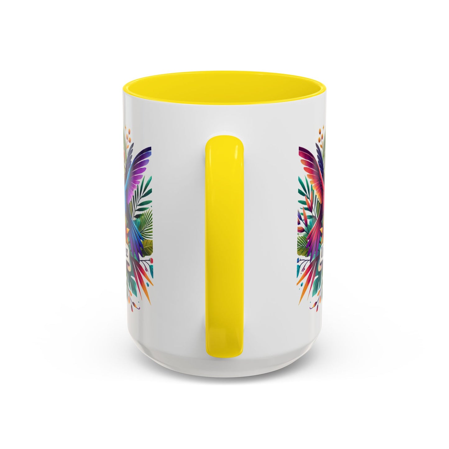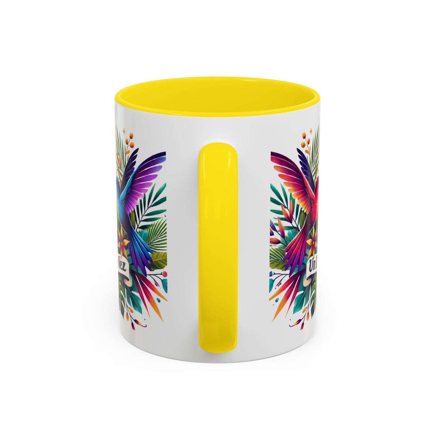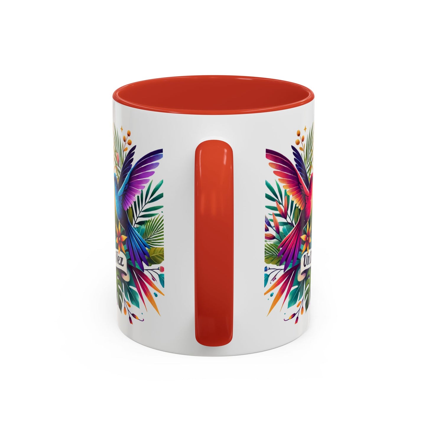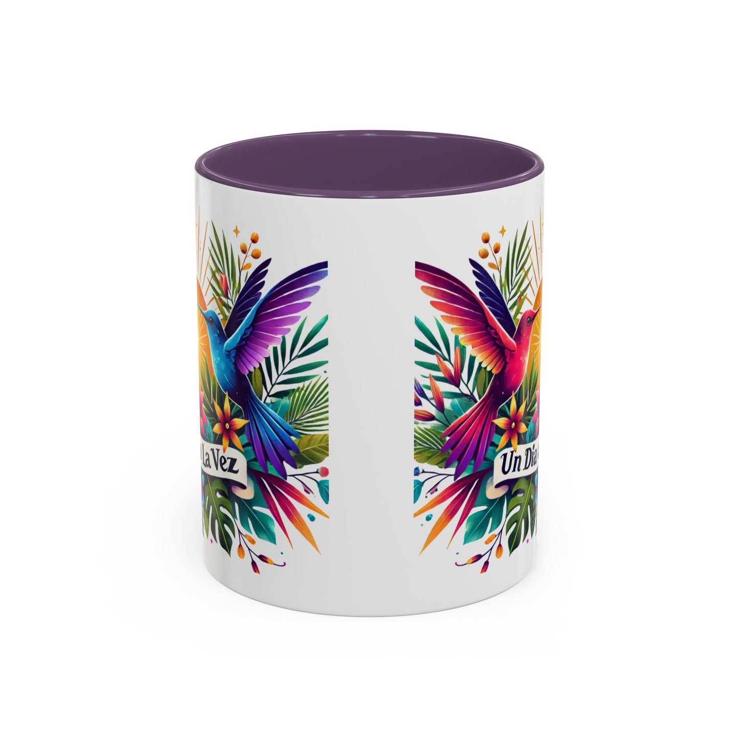Start your day with a little inspiration and a splash of color! The Un Día a la Vez accent coffee mug features a stunning tropical design with radiant hummingbirds, lush flowers, and a golden sunrise—reminding you to take life one day at a time. Crafted from durable white ceramic with a glossy finish, this mug is as practical as it is beautiful. Choose from two generous sizes, 11oz or 15oz, to hold your favorite brew, and enjoy its stylish contrast interior and handle for an extra pop of personality.