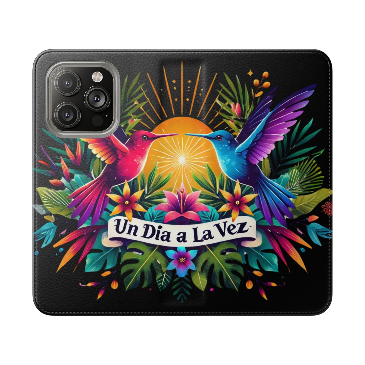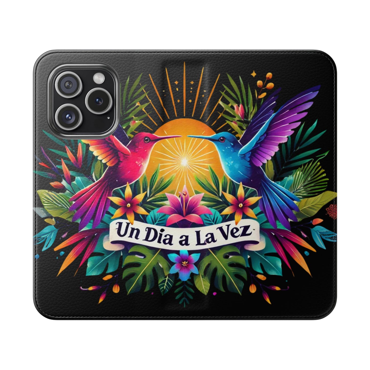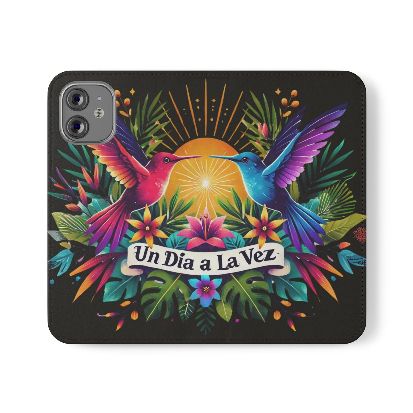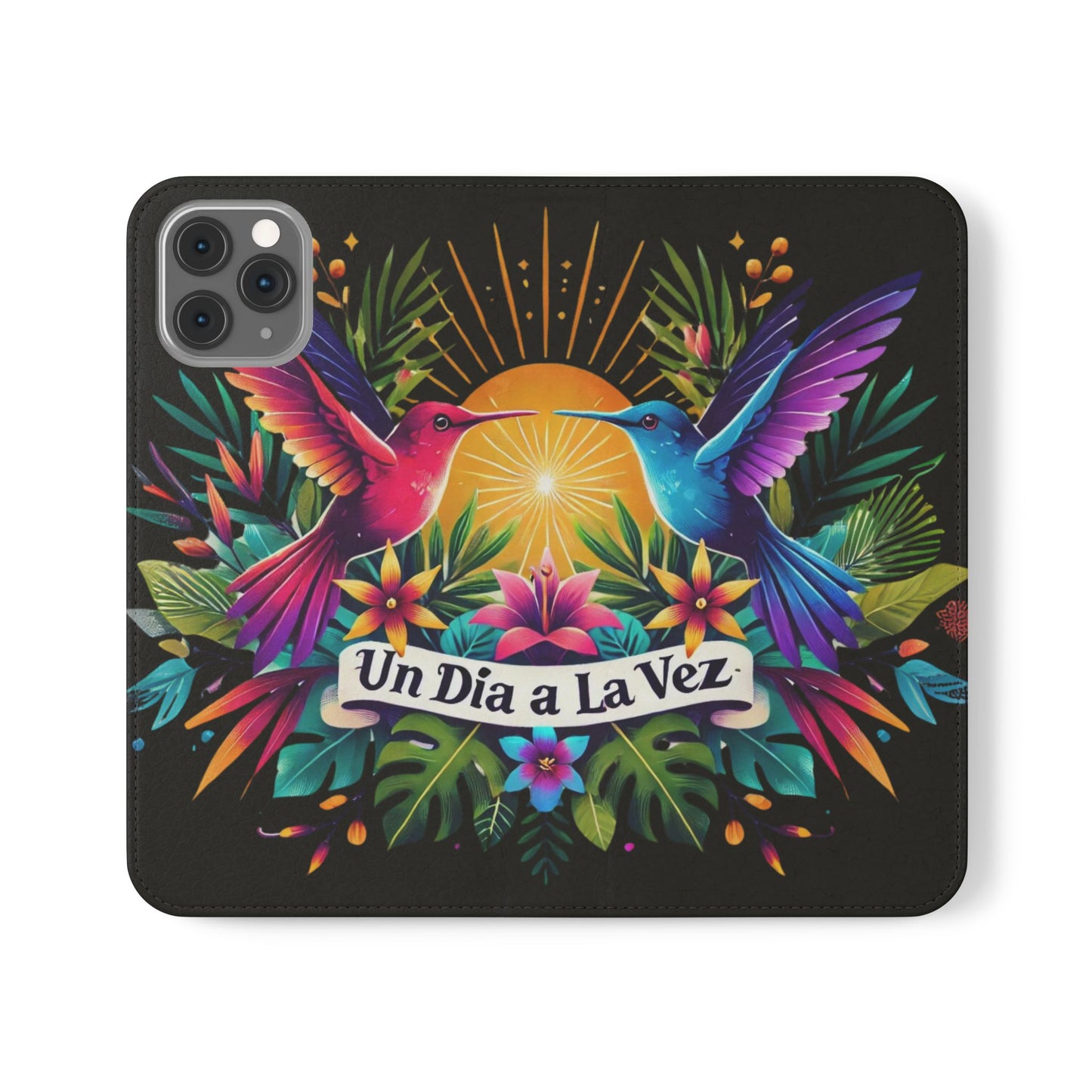 Carry inspiration and protection wherever you go with the "Un Día a La Vez" Vibrant Midnight Flip Case. Featuring a dazzling design of radiant hummingbirds, lush florals, and a glowing sunrise against a bold black backdrop, this case is as stunning as it is functional. With vibrant colors, sturdy faux leather, and built-in features for convenience, it’s the perfect blend of style and practicality for your phone. 🌺✨