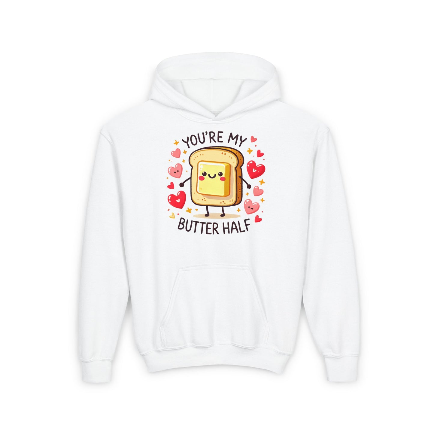 Toast to love with the "You’re My Butter Half" Youth Hoodie! Featuring an adorable toast and butter duo surrounded by hearts, this cozy hoodie is the perfect way for your little one to share their buttery smooth charm. Whether it’s Valentine’s Day or just spreading joy, this hoodie will keep them warm and stylish all year long.